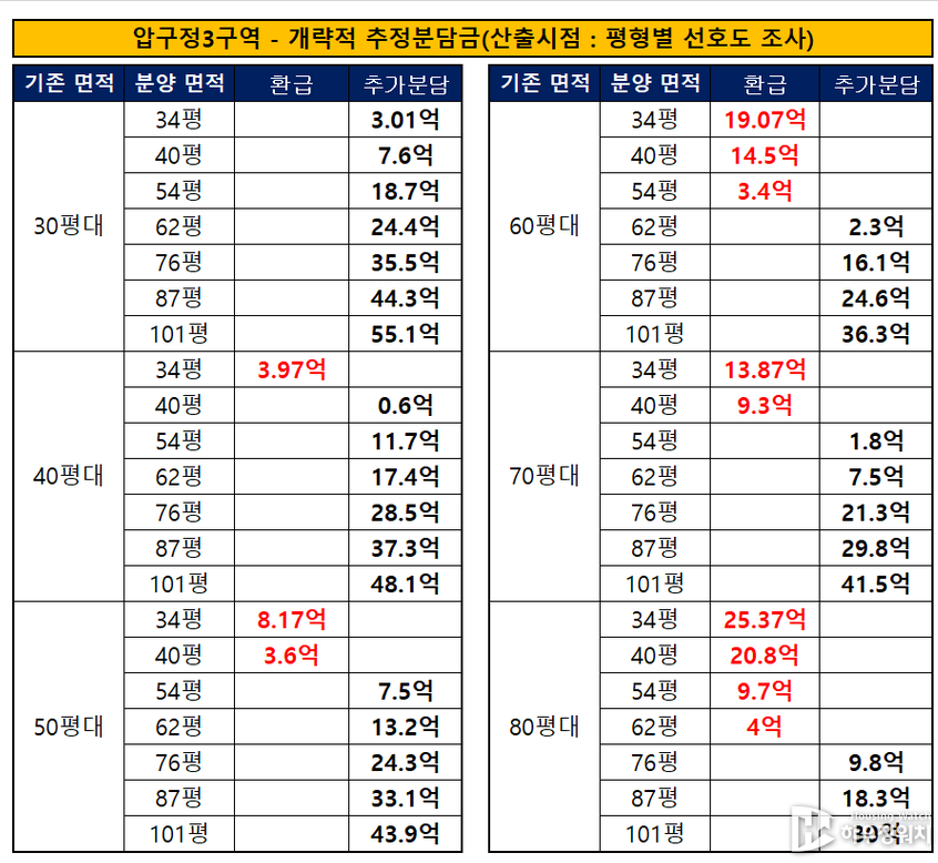 1월31일 압구정3구역 재건축 조합(조합장 안중근)이 희림건축과 본격적인 정비계획(안) 수립에 나서기전 조합원에게 개략적인 추정부담금을 공개해 관심이 모아지고 있습니다.