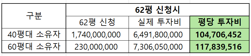 평당 투자비를 환산한 결과를 보면 43평 매입 →62평 신청(1억470만원)< 63평 매입 → 62평 신청(1억1783만원)< 43평 매입 →40평 신청(평당 1억2029만원)<63평 매입→40평 신청(1억4065만원)으로 평당 투자금이 높아집니다.
